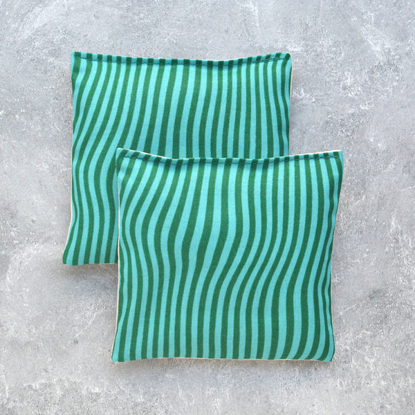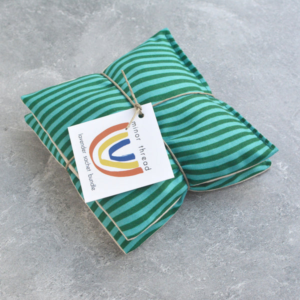 + These sachets are made with a wavy stripe pattern in shades of teal, backed with natural linen.