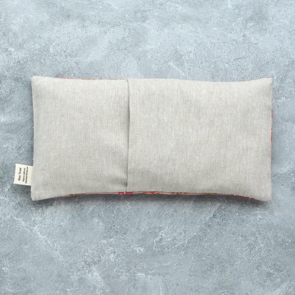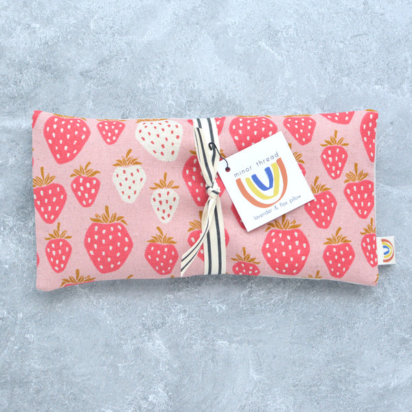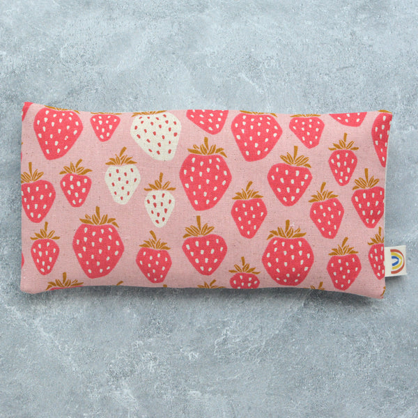 This weighted eye pillow is made with a modern canvas fabric with giant strawberries on pink and features an inner pouch filled with flax seeds and optional mint leaf or lavender flowers. These pillows can be frozen for cooling relief or gentle microwaved for warm comfort.