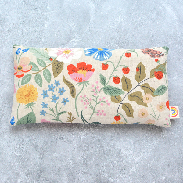 - Inner: White flannel pouch containing flax seeds and optional organic lavender flowers or dried peppermint leaves